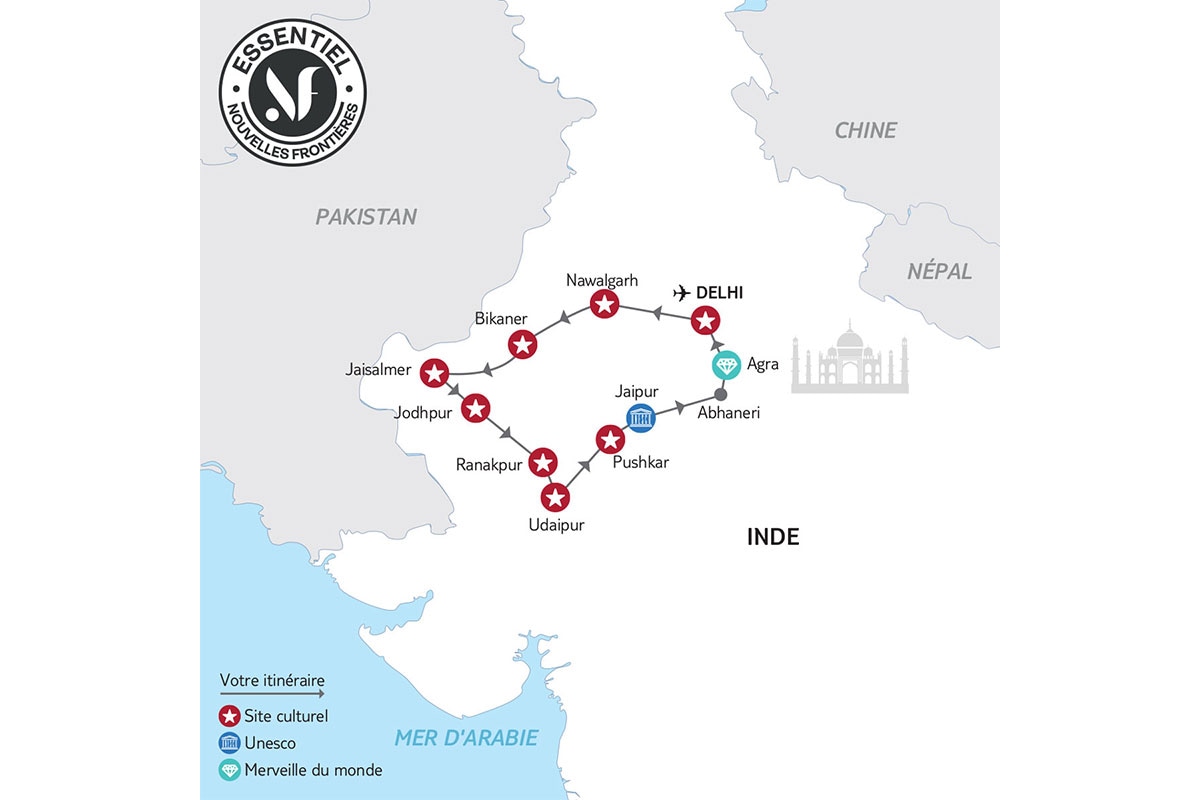Pour des raisons opérationnelles, la nuit et la visite à Nawalgarh le jour 3 pourra se faire à Mandawa. L’intérieur de certains temples est inaccessible aux non-hindous et lors de certaines fêtes, jours fériés et jours de congés locaux. En raison d’événements locaux (mariages…), des modifications de dernières minutes concernant les nuitées pourront survenir, des hébergements alternatifs seront confirmés et toutes les visites seront respectées, avec un ordre parfois différent. Si l'arrivée sur le site du Taj Mahal a lieu un vendredi, vous ne pourrez voir que l'extérieur du monument.